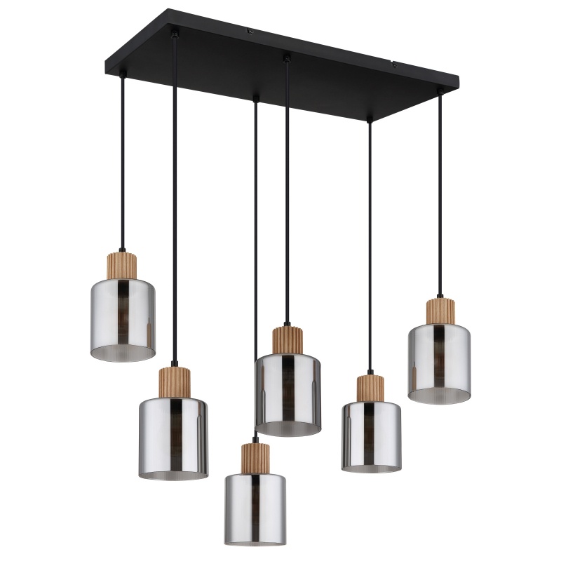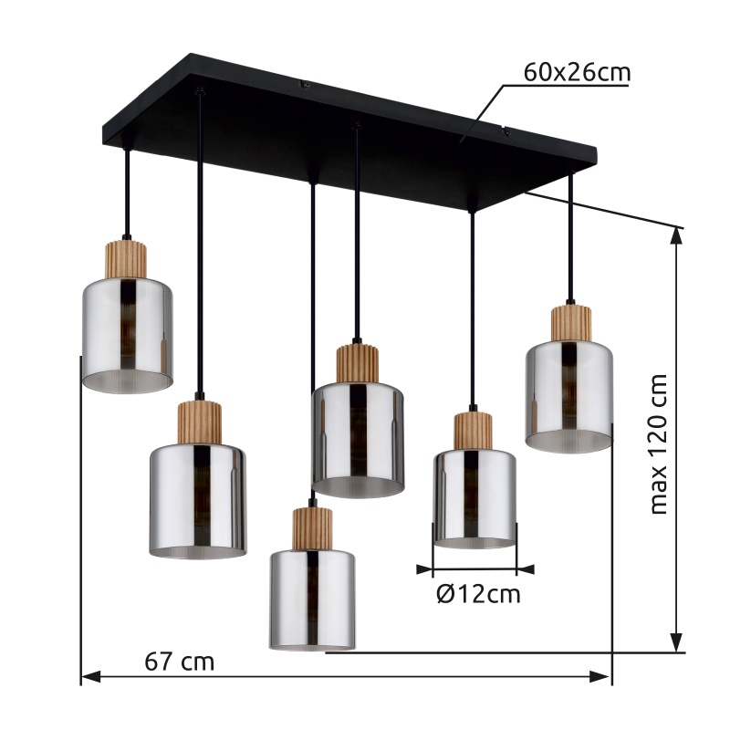 laelamp metall must matt, puit tumepruun, klaas suitsuvärvi, kaabel PVC must, vähendatav kõrgus, PxLxK: 670x330x1200mm, v.a 6x E27 25W 230V
