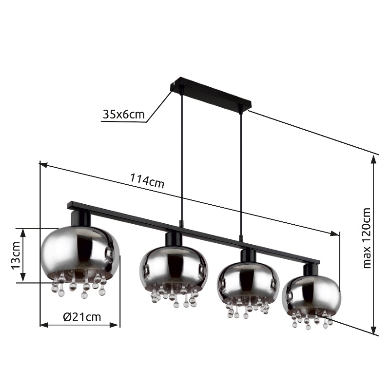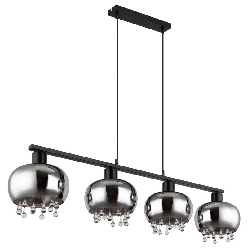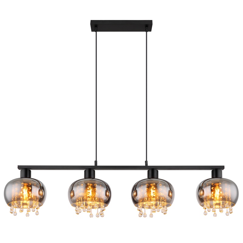 pendant lamp metal black matt, glass smoke colored, glass crystals clear, cable Textile black, Height reducible (pendant lamp), LxWxH: 1140x210x1200mm, excl. 4x E27 LED 9W 230V