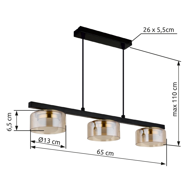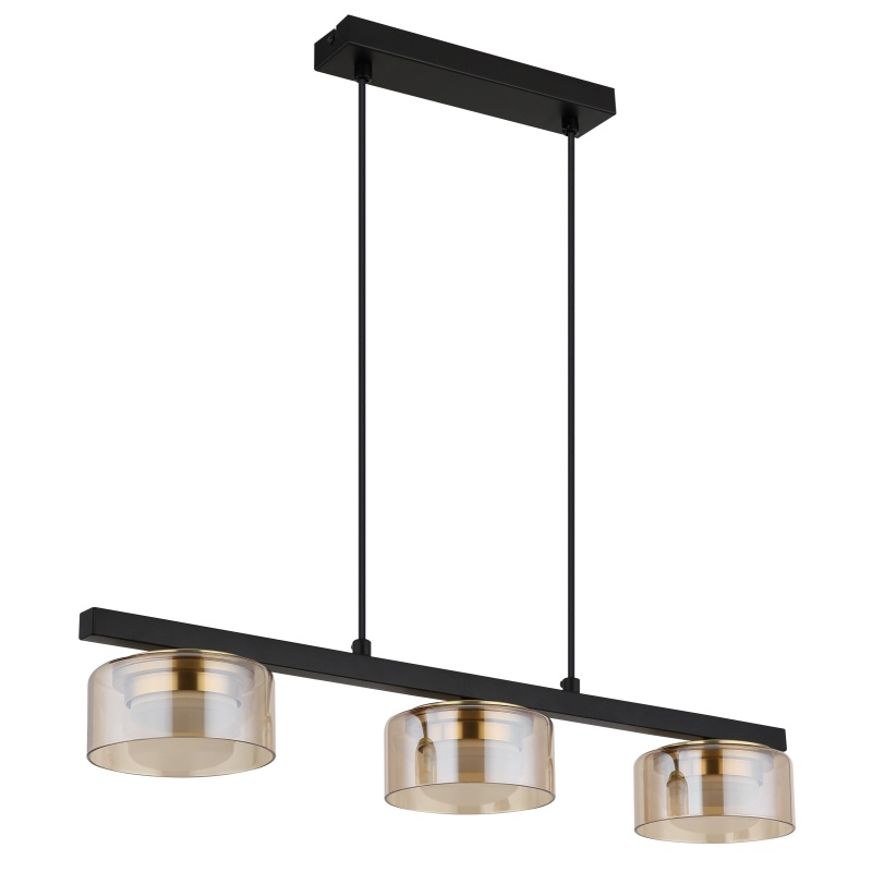 laelamp metall must matt, alumiiniumkuld värvi harjatud, klaas merevaigukollane, kaabel PVC must, PxLxK: 650x130x1100mm, sh 3x GX53 LED 6W 230V, 400lm allikas, 330lm väljund, 1800K, tindi. LED pirn 10162