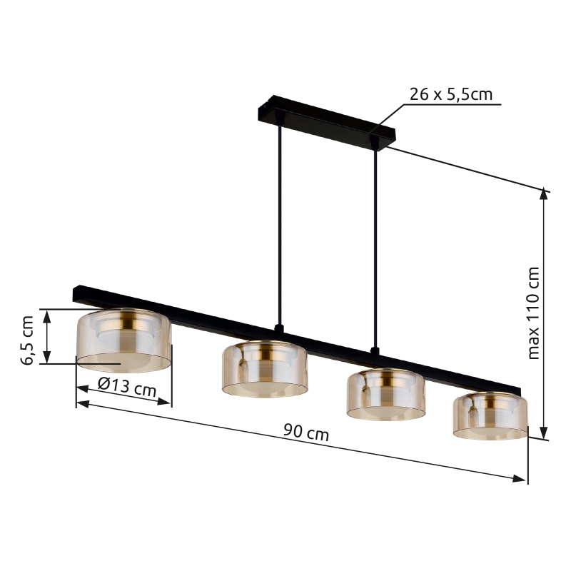 laelamp metall must matt, alumiinium kuld värvi harjatud, klaas merevaigukollane, kaabel PVC must, PxLxK: 900x130x1100mm, sh 4x GX53 LED 6W 230V, 400lm allikas, 330lm väljund, 1800K, tindi. LED pirn 10162