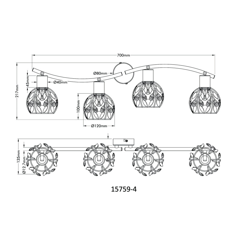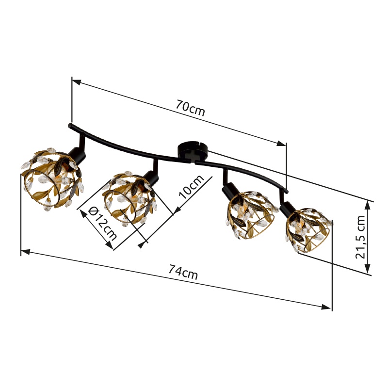 prožektorid metall must matt, metall kuldsed värvid, must patineeritud, akrüül kristallselge, pööratav / pööratav, PxLxK: 700x120x155mm, v.a 4x E14 25W 230V