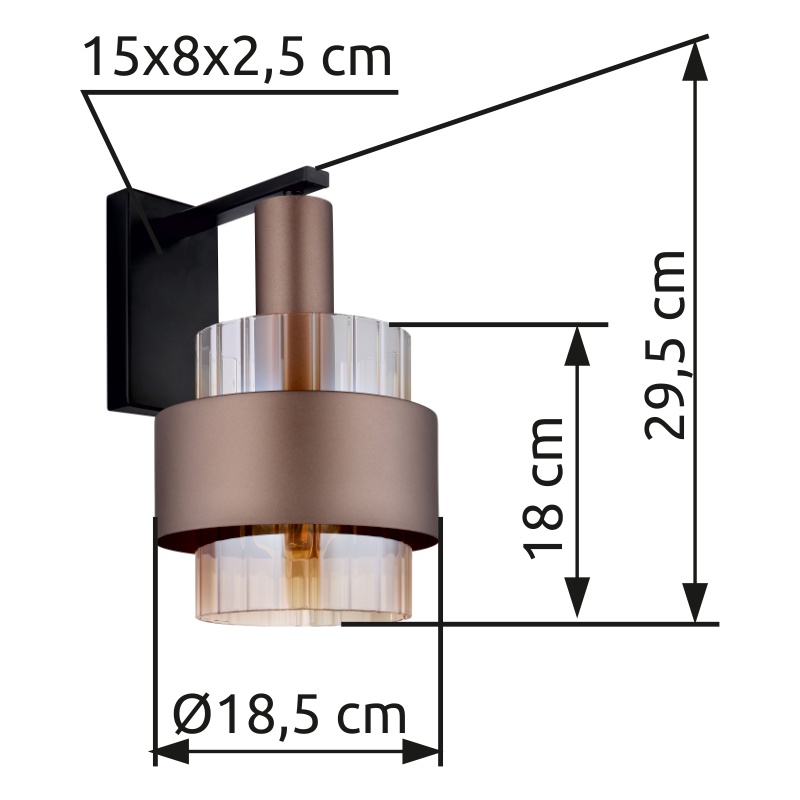 seina kergmetall must matt, klaas merevaigukollane, läbipaistev segu, metall pronksivärvi, valguse läike Suund: alla, LxK: 185x295mm, AL: 235mm, v.a 1x E27 60W 230V