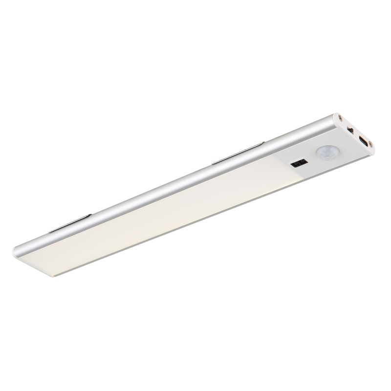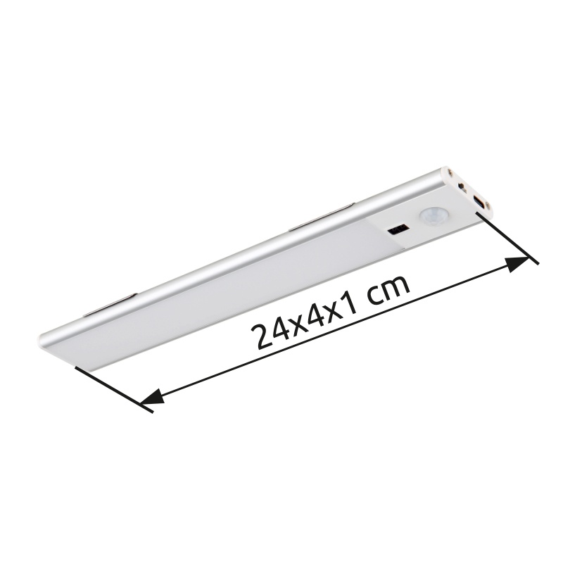 kapp hele alumiinium hõbedane värv matt, plastik valge, kaabel PVC must, hämardatav, värvi fikseerimine, v.a adapter, USB-A 2.0-USB-C, Accu inc. CR18650 1100mAh 3.7V, andur sh. PxLxK: 240x40x10mm, kaabli pikkus 500mm, LED 1.4W 230V, 120lm allikas, 100lm väljund, 4000K