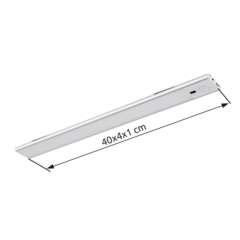 kapp hele alumiinium hõbedane värv matt, plastik valge matt / valge, kaabel PVC must, hämardatav, värvi fikseerimine, USB-A 2.0-USB-C, Accu sh. CR18650 1100mAh 3.7V, andur k., 400x40x10mm, kaabli pikkus 500mm, sh. LED 2.5W 230V, 280lm allikas, 200lm väljund, 4000K